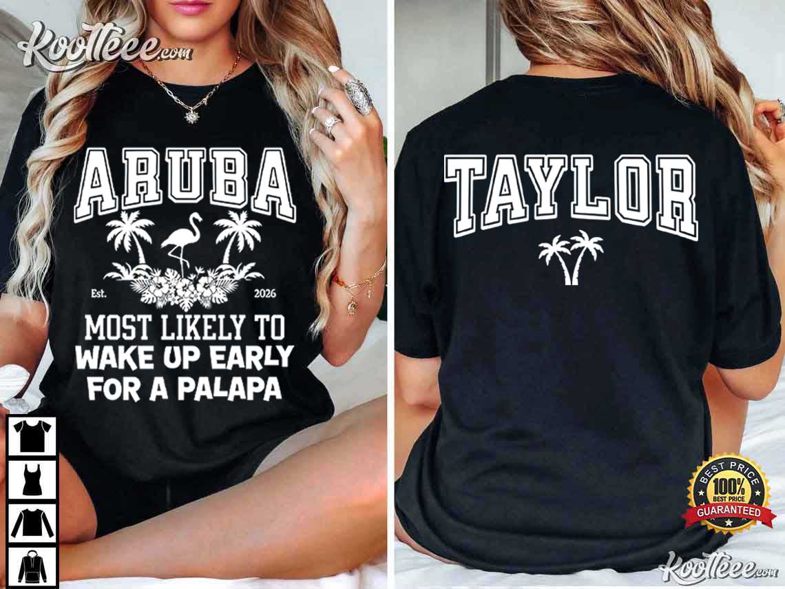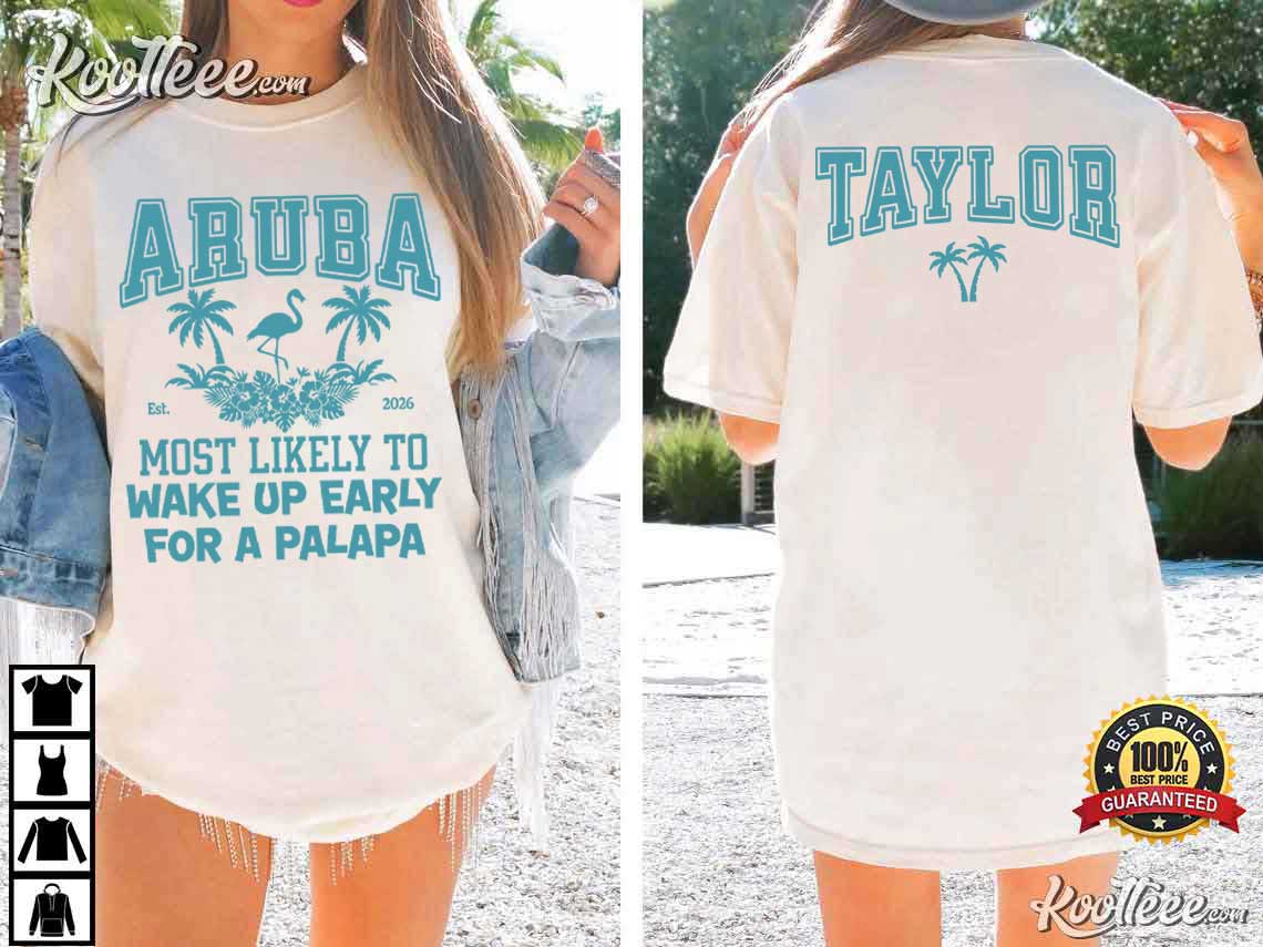 The bright “ARUBA” letters, palm trees, flamingo drawing, and hilarious saying “Most Likely to Wake Up Early for a Palapa” on this tee are excellent for a beach vacation. You may also write your name on the back, which makes each shirt a one-of-a-kind reminder of your journey.