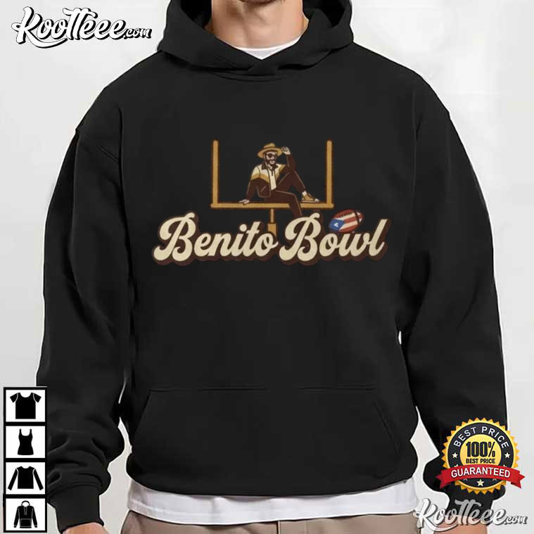 If you realize that halftime can be just as legendary as kickoff, the Benito Bowl Puerto Rico Latin Artist Halftime Show 2026 T-Shirt is for you. This shirt has a retro sports graphic of a relaxed character sitting proudly on top of football goalposts, with big “Benito Bowl” lettering underneath. It combines the intensity of a stadium with the culture of Latin music in a fun, wearable way.