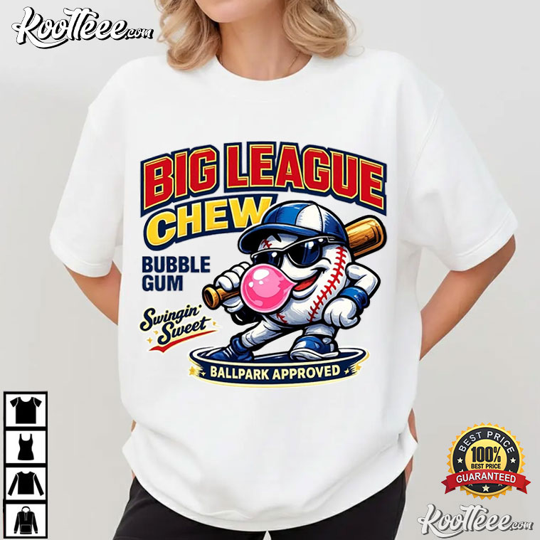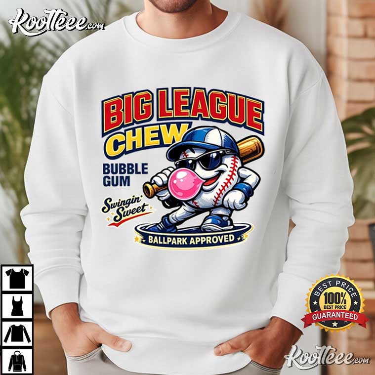The Big League Chew Baseball Mascot T-Shirt honors that tradition with a fun graphic of a cartoon baseball mascot striking a bat and blowing a huge bubble.