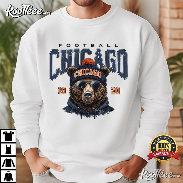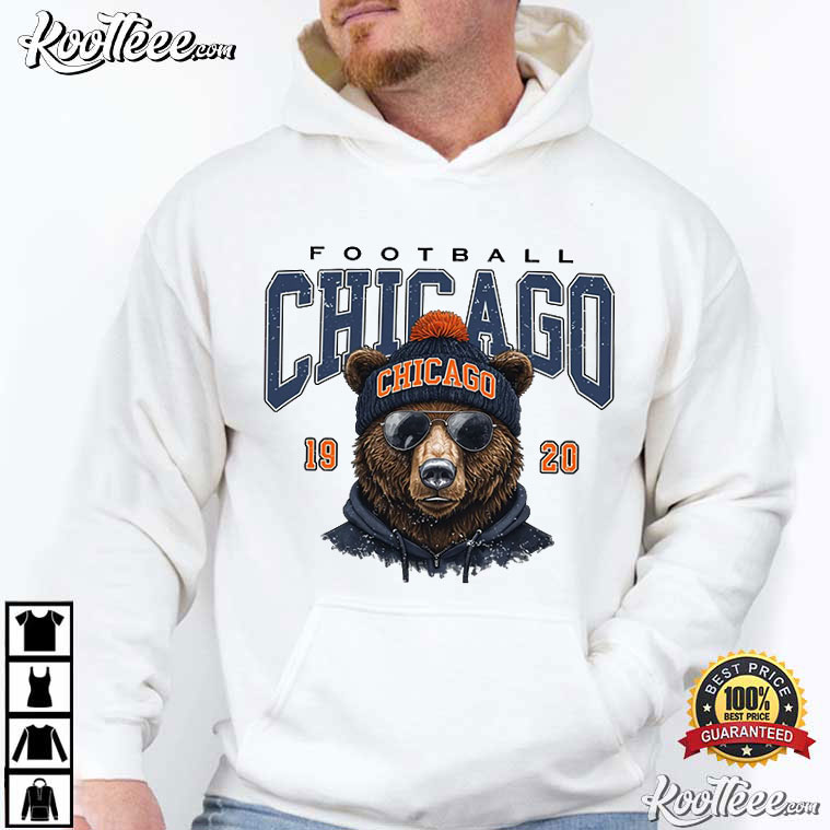 A strong bear mascot in winter clothes—beanie, scarf, and dark shades—stands proudly in front of the word “Chicago” and the year 1920, which is when the franchise started. It’s a visual reminder that Chicago football has always been about being tough, bouncing back, and turning up no matter what the weather is like.