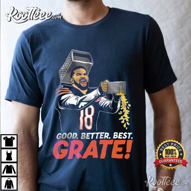 The main part of the design is a cartoon-style picture of Caleb Williams with a Bears jersey and the famous cheese grater helmet. The phrase “Good. Better. Best. GRATE!” is the punchline as the shredded cheese falls. Bears fans will recognize it right away since it is smart wordplay.