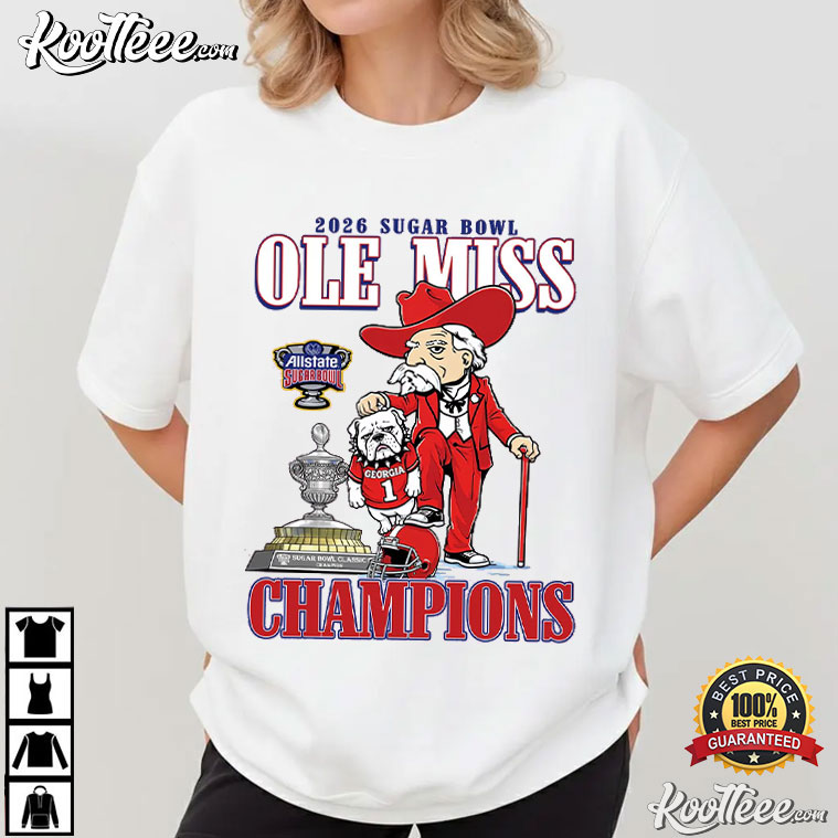 The artwork boldly shows that the Ole Miss Rebels are the 2026 Sugar Bowl Champions. It uses old-fashioned character art, trophy symbols, and bold text to make a style that feels timeless instead of fashionable.