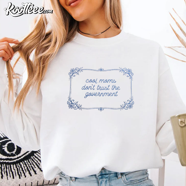 The Cool Moms Don’t Trust The Government Embroidered Sweatshirt has a strong personality and beautiful stitching. The design looks old-fashioned and feminine at first glance, with blue script letters inside a pretty border.