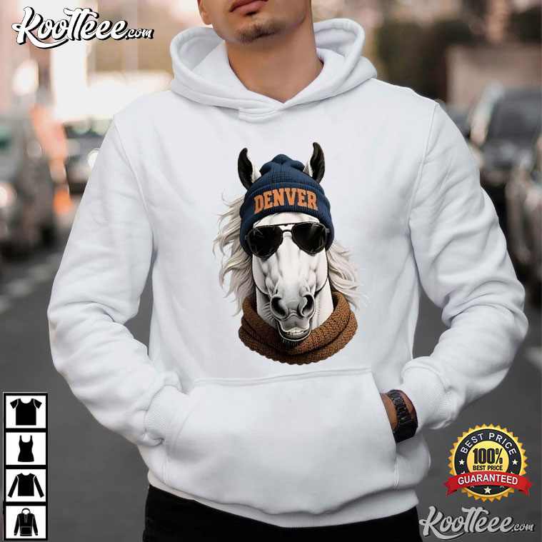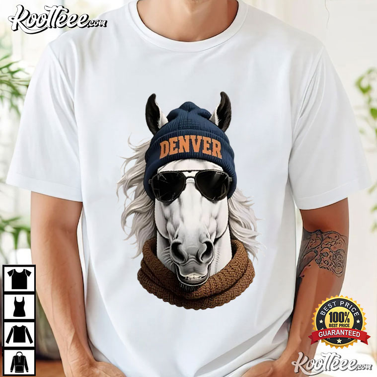 This Denver Broncos Football Mascot Fan Merch T-Shirt is for fans who enjoy their game-day clothes to have personality. It’s bold, fun, and very Denver. This design mixes modern street-style comedy with football love by showing a cute horse mascot wearing a DENVER beanie, sunglasses, and a cozy scarf.