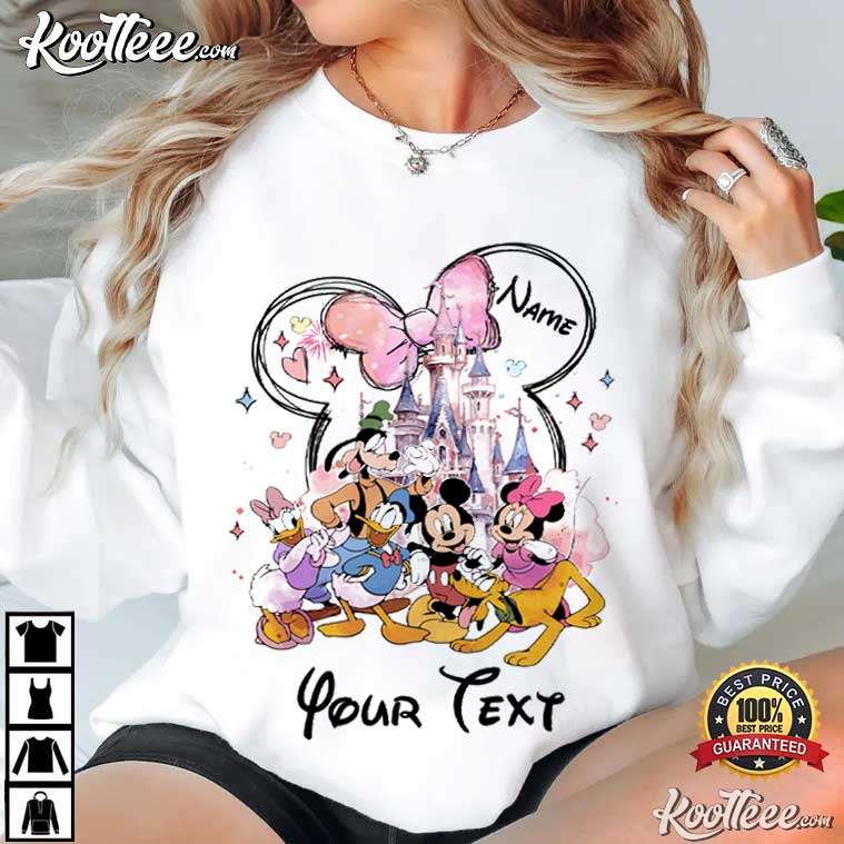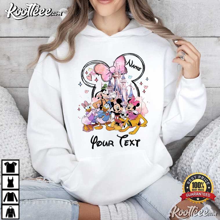 The Disney Family Matching Vacation Outfit Custom T-Shirt is intended to bring the magic to life. This shirt, which features favorite Disney characters assembled in front of a dreamlike castle silhouette framed in an unmistakable mouse-ear design, is more than just clothes. It is a keepsake.