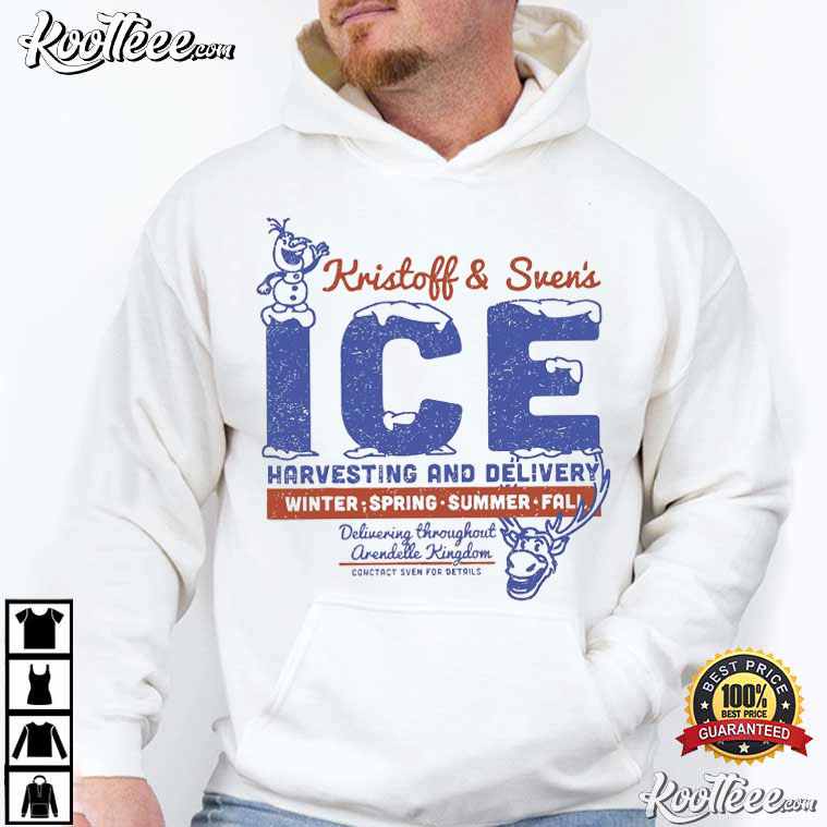 This Disney Frozen Kristoff Sven Ice Harvesting T-Shirt honors that humble origins with a fun, retro-style graphic that looks like an old-school ice delivery company commercial from Arendelle.