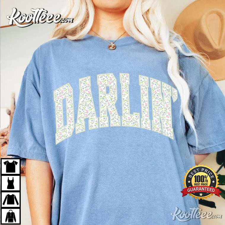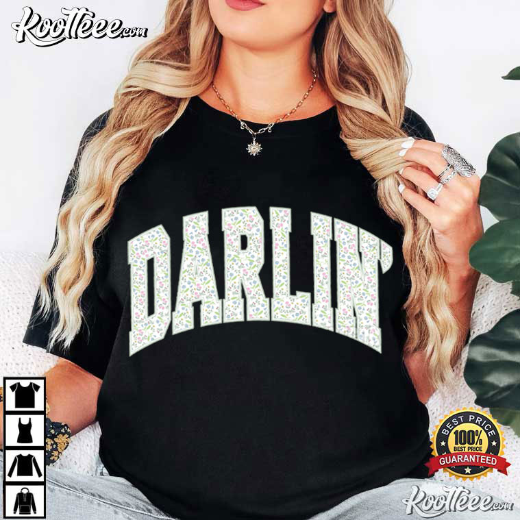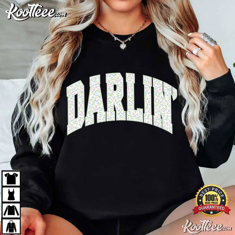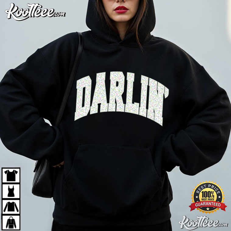 The big, collegiate-style “DARLIN” letters on the chest are packed with subtle ditsy floral motifs. The little pastel flowers make the bold varsity typeface look softer, which is the right mix of sporty and sweet.