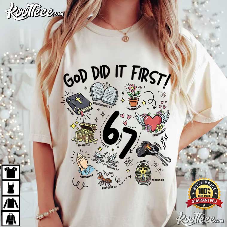 God Did It First The Jesus Christian 6 7 Meme T-Shirt combines modern internet fun with age-old biblical truth. The prominent “6 7” reference is at the center of the design, and it is surrounded by hand-drawn Christian symbols and Bible verses. The phrase “God Did It First!” is a smart approach to remind us that God’s labor and knowledge always come before trends.