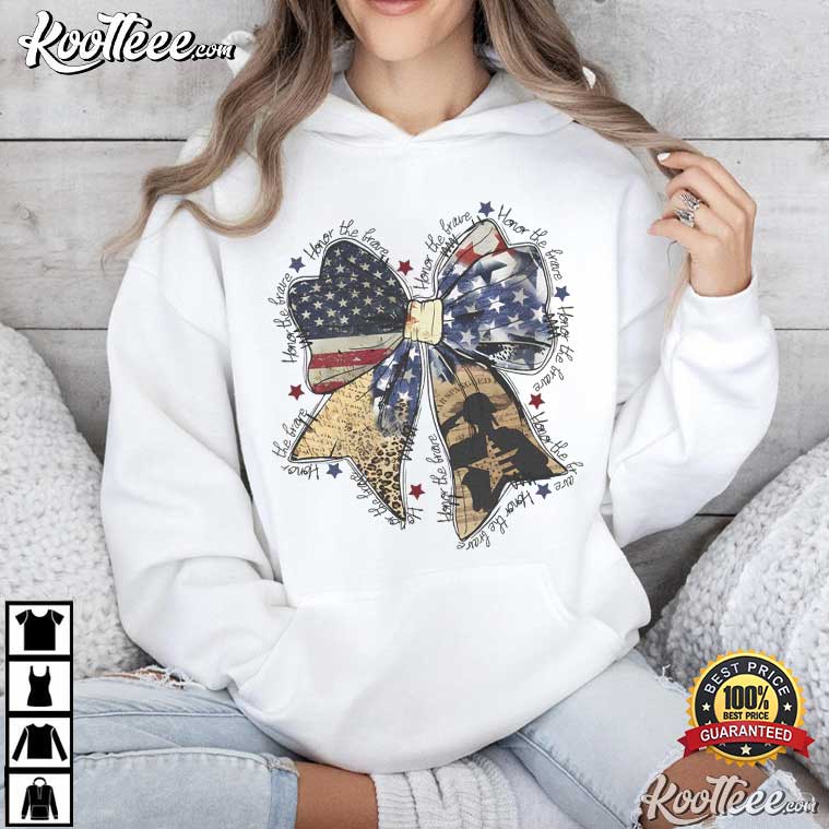 The Honor The Brave American Flag Patriotic T-Shirt is a stylish and patriotic shirt that makes a statement. In the middle is a beautifully drawn bow with the American flag on it. This stands for unity, remembering, and national pride.