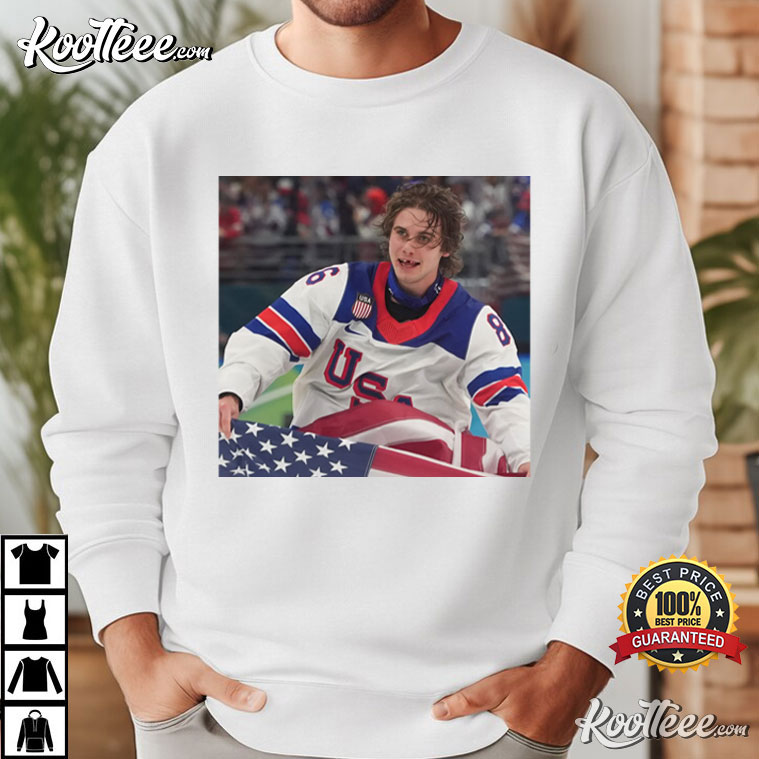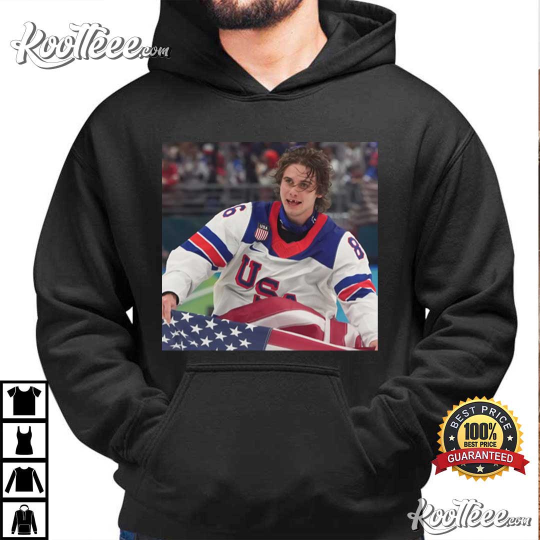The Jack Hughes Hockey USA American Flag T-Shirt shows a powerful moment on the ice with Jack Hughes in his Team USA jersey and the American flag behind him. The picture combines the passion of sports with national symbols. It’s a glimpse of competitive fire covered in red, white, and blue.