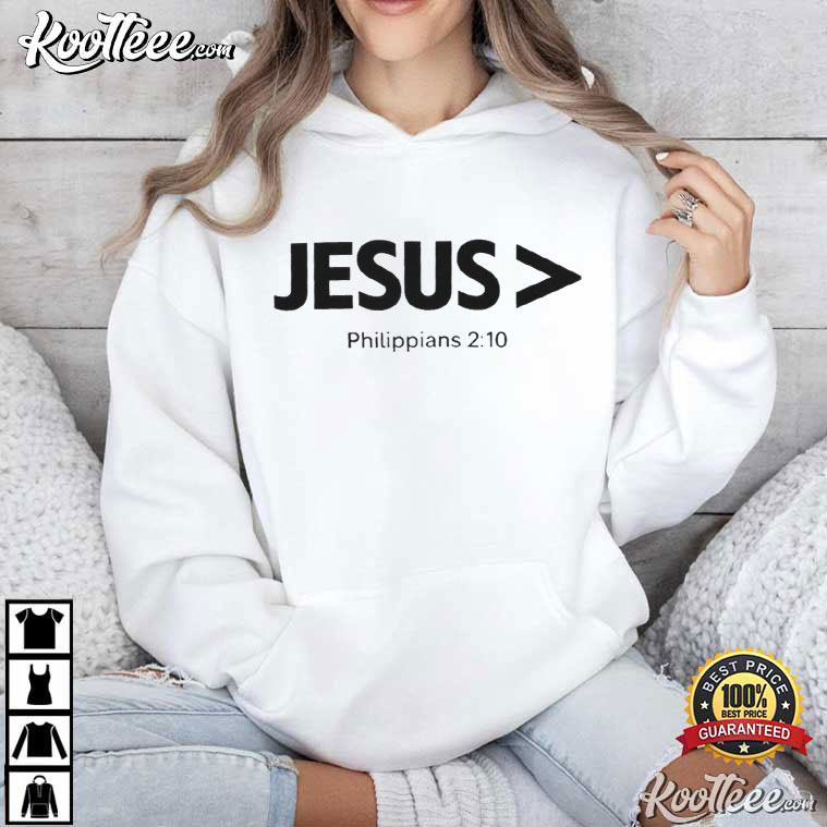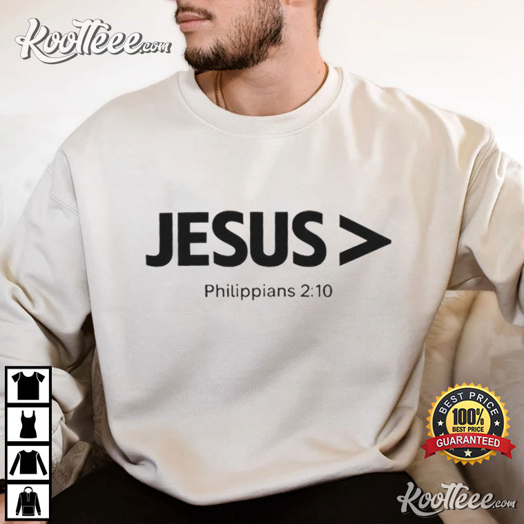 The Jesus Is Greater Than Philippians 2:10 Christian T-Shirt is a simple, bold design.