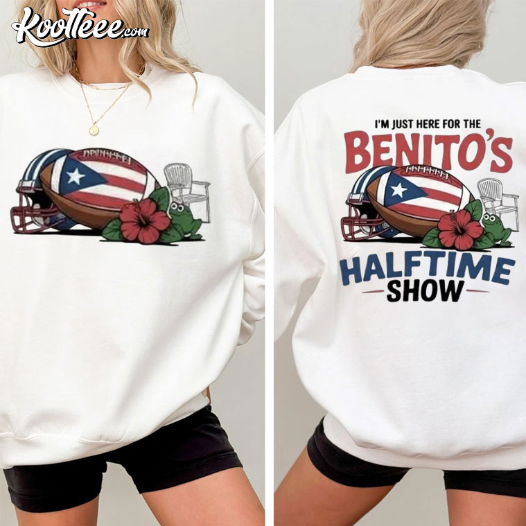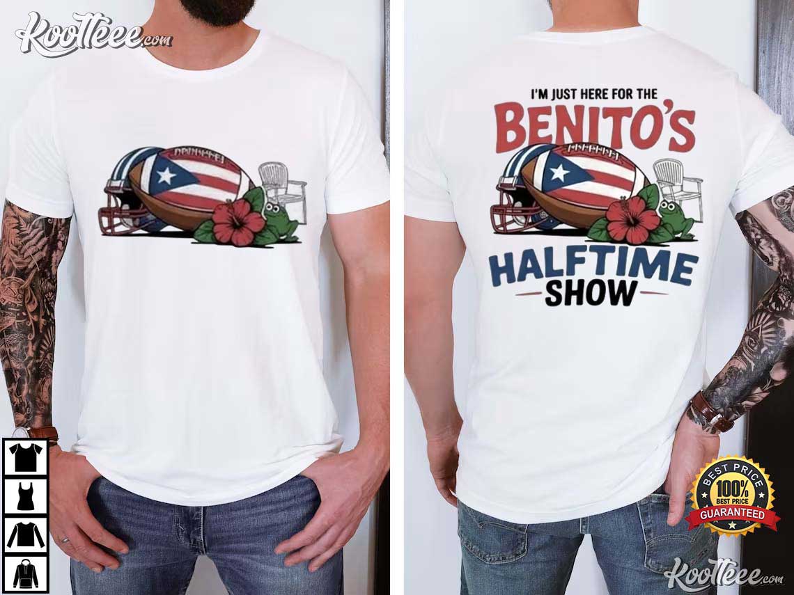 The Just Here For The Benito Bowl Bad Bunny Halftime Show 2026 T-Shirt is for people who care more about the music, the show, and the halftime vibe than the score. This shirt is a fantastic mix of sports culture and Latin music passion. It has a big back print that says “I’m Just Here For The Benito’s Halftime Show” and a front chest graphic of a football helmet inspired by Puerto Rico.