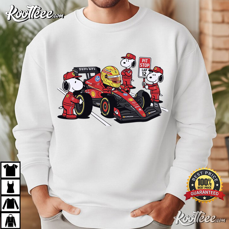 The Lewis Hamilton Snoopy Pit Crew F1 Ferrari Racing Cartoon T-Shirt is a fun cartoon design that shows Formula 1 pit crew and fits well with the high-energy racing culture.