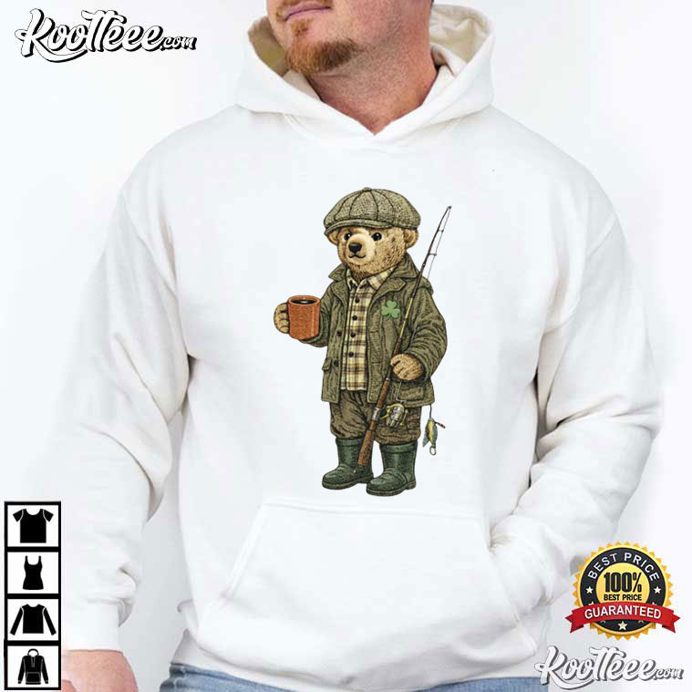 In the middle of the design is a cute teddy bear dressed like a fisherman from the Irish countryside. He has on a plaid shirt, a flat cap, a tough jacket, and tall boots. In one hand, he holds a fishing rod, while in the other, he holds a warm cup. A small shamrock detail connects everything to St. Patrick’s Day.