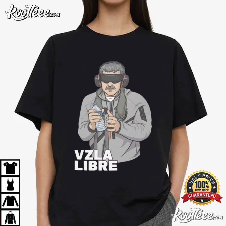 This image has a stylized depiction of Nicolás Maduro in the middle. It shows him being caught not too long ago with the words “VZLA LIBRE,” which is Spanish for “Free Venezuela.” This shirt gets people talking and draws their attention by combining political criticism, world news, and cultural expression.