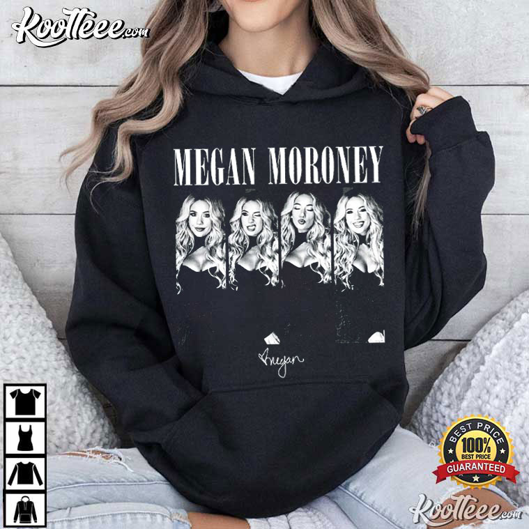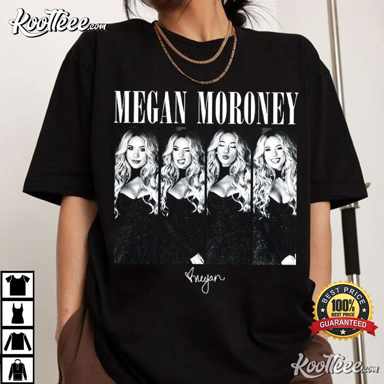 This shirt has a striking four-panel image of Megan Moroney, with each panel showing a distinct expression: playful, confident, fierce, and radiant. Her name is written in classic serif letters above the pictures, and below, a small signature element gives it a personal, almost collectible sense.