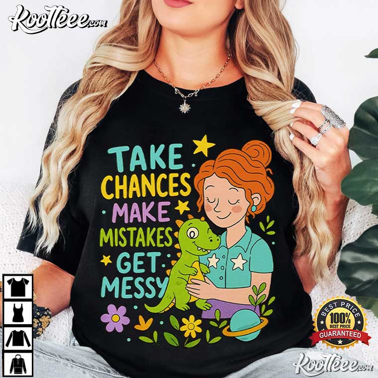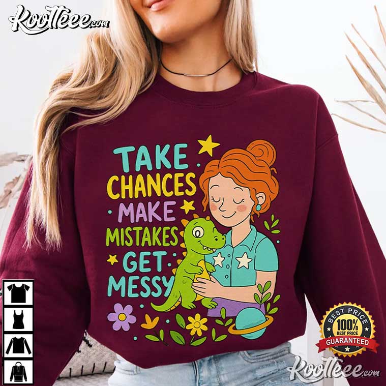 The Miss Frizzle Teacher Take Chances Make Mistakes Get Messy T-Shirt celebrates the brave, creative energy that fills the classroom. This design is full of happiness and creativity. It shows a happy red-haired instructor holding a baby green dinosaur, with beautiful flowers and stars all around.