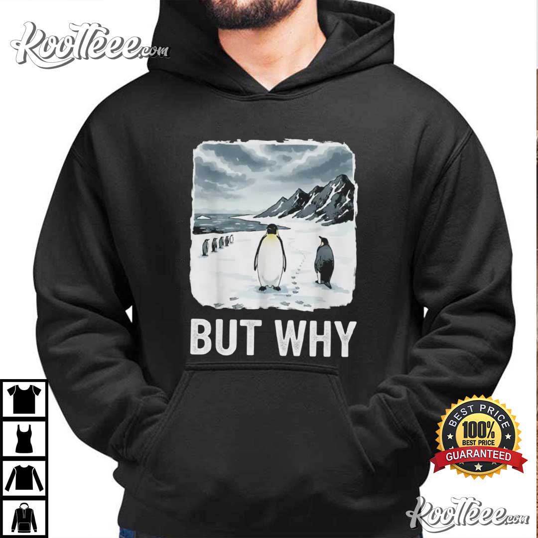 The Nihilist Penguin But Why Funny Existential Meme T-Shirt perfectly expresses a certain modern feeling: standing in the middle of everything, looking around, and quietly wondering… But why? This design blends existential humor into something oddly pleasant and highly wearable. The somber polar scenery, faraway mountains, and a bunch of penguins frozen in time make it all work.