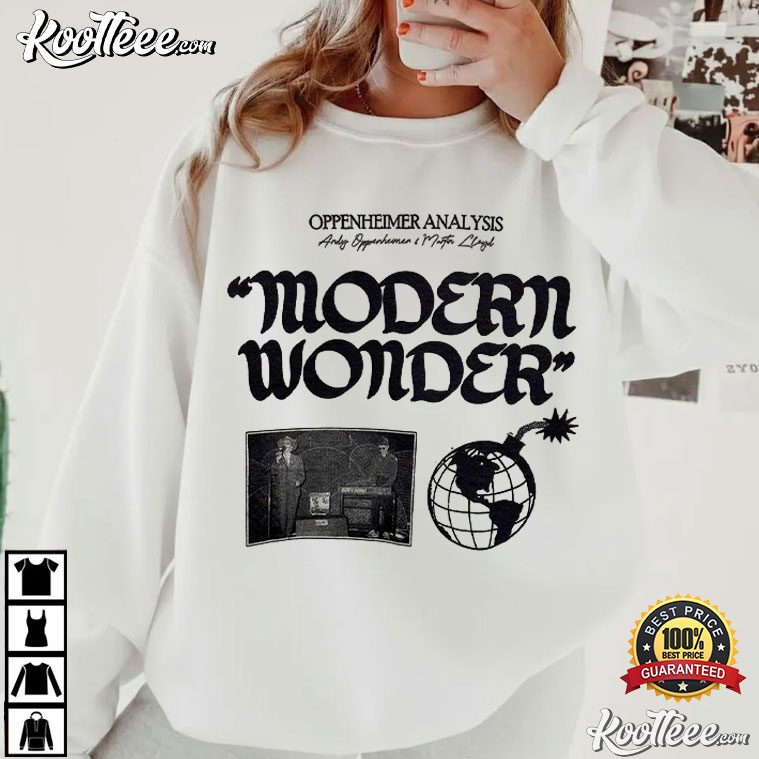 The Oppenheimer Analysis Modern Wonder Fan Art T-Shirt is a simple, monochrome design that fits the mood of the piece. The words “Oppenheimer Analysis” are at the top, and below that is a credit line that looks like it was written by hand. The phrase “Modern Wonder” is in bold, dramatic vintage typeface and appears at the center of the page. A small black-and-white scene below it reminds me of laboratory pictures, and a globe with a lit fuse makes a dramatic symbolic visual.