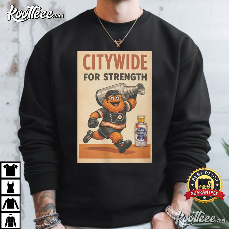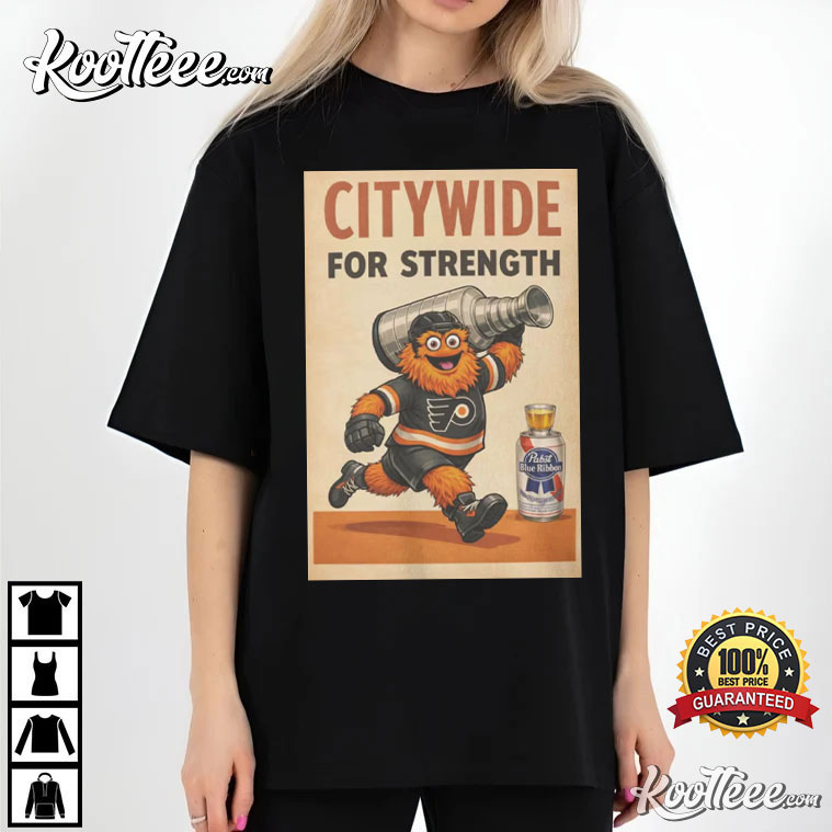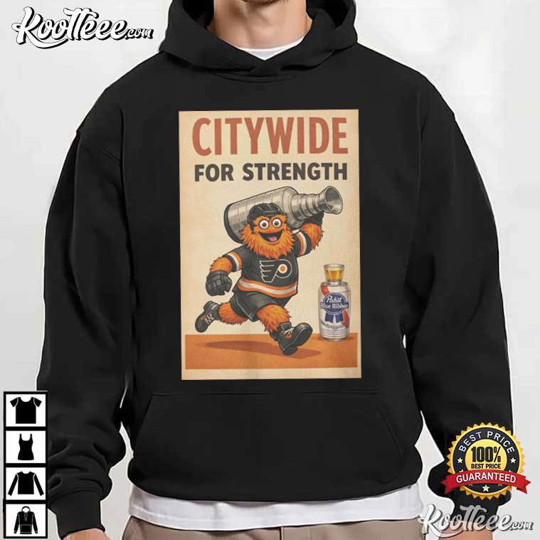 Right up front is the awesome Flyers mascot, Gritty, charging ahead with a championship-style trophy—bringing all the energy, chaos, and determination. The retro slogan “Citywide For Strength” really gives the design a classic vibe, kind of like an old-school propaganda poster, highlighting the spirit of togetherness and toughness throughout the city.