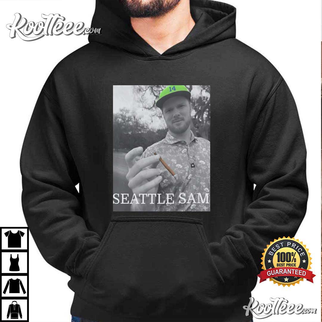 The main focus of the design is a grungy, candid-style picture that seems like it originated from a football timeline that went viral. It’s relaxed, a little rough around the edges, and confident—just the proper tone for NFL memes. The words “Seattle Sam” at the bottom of the picture give it significance and make it a full-on fan statement that Seahawks supporters will recognize straight away.
