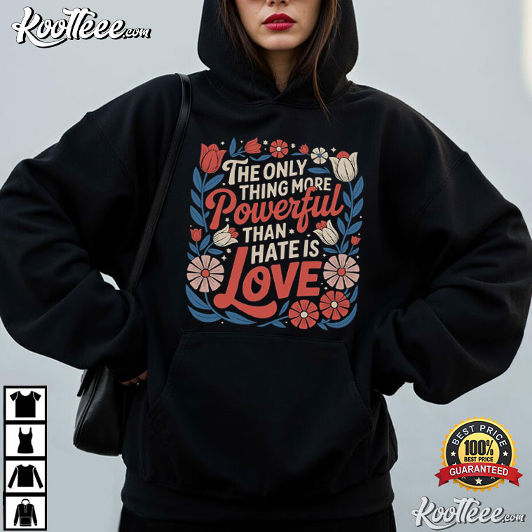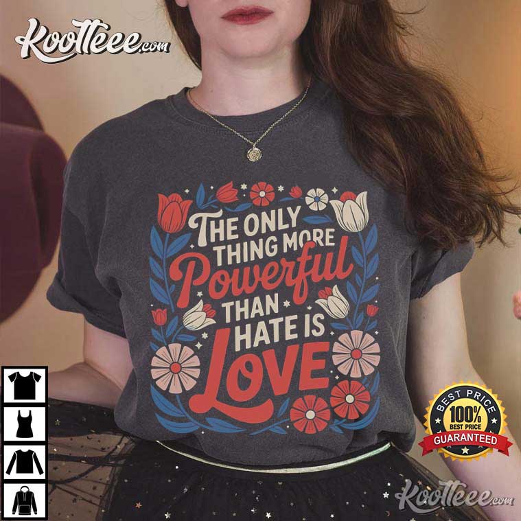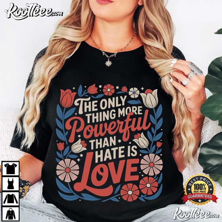 The Super Bowl 2026 Only Thing More Powerful Than Hate Is Love T-Shirt combines bold retro text and a vivid floral design to send a powerful message during one of the world’s most watched sporting events.