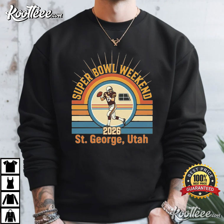The Super Bowl Weekend St. George Utah 70’s Theme Football T-Shirt is for those that enjoy the game and the look of it just as much. This shirt is inspired by vintage sports graphics from the 1970s. It has vivid sunset stripes, retro writing, and an old-school football silhouette that make it feel like it’s from a highlight reel from the golden age.