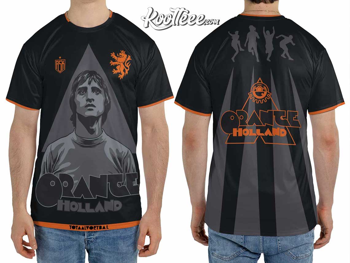 Check out our The Netherlands Clockwork Oranje 3D T-Shirt and celebrate the awesome strategy of the “Clockwork Oranje.” This design pays homage to the iconic number 14, the trailblazer of Total Football. The front shows a bold, high-contrast portrait of Johan Cruyff, surrounded by the classic Dutch lion crest.