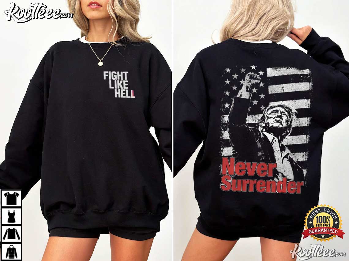 The Trump Never Surrender—A Defining Moment T-Shirt is for people in that second group. It has a strong, high-energy image and a message that is easy to understand.