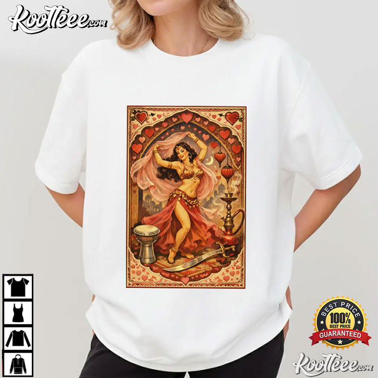 The Vintage Valentine Belly Dancer 2026 T-Shirt is a work of art that you may wear. It has a mix of Middle Eastern art, romantic themes, and the classic pin-up style. The shirt looks like an old poster that has been patched up. It’s all about how things look, move, and feel. It’s great for folks who like retro trends with a sensual, daring edge.