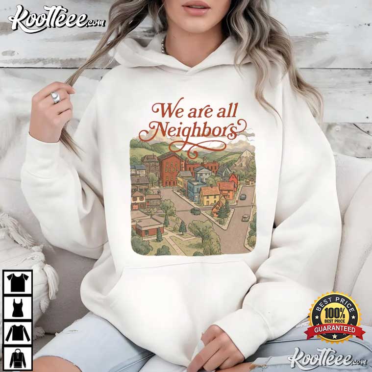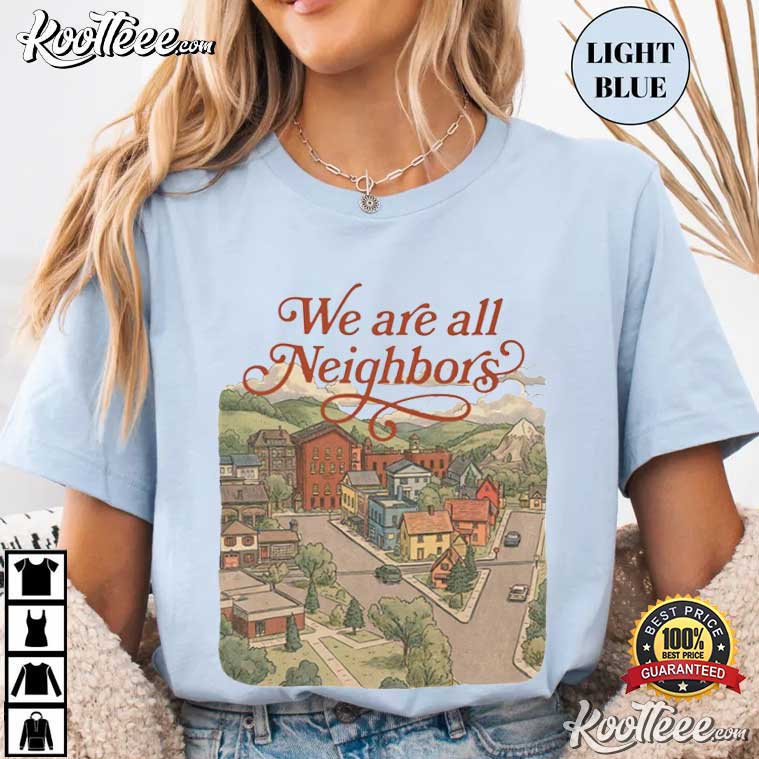 The We Are All Neighbors Community Resistance Protest Anti-ICE T-Shirt is more than just a shirt. It reminds us of our shared humanity and calls for peaceful civic action. The words “We are all Neighbors” and the warm, illustrated neighborhood setting on this design are about working together in a community, being fair, and treating everyone with respect and decency.