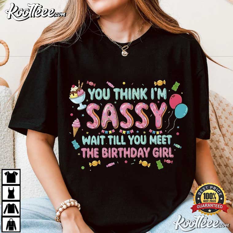 The You Think I’m Sassy Wait Till You Meet The Birthday Girl T-Shirt is for folks who are brave, funny, and know that every birthday party needs a little bit of fun mayhem. This shirt makes you feel like you’re at a party before it even starts. The colorful letters, candy-like images, balloons, and party vibes all around the design make it feel like a party.